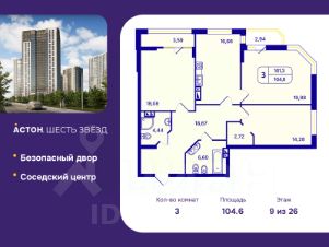 Трехкомнатная квартира от застройщика с предчистовой отделкой в ЖК "Астон. Шесть Звезд" на 9 этаже. Общая площадь: 104.6 кв.м., жилая: 52.24 кв.м., площадь просторной кухни-столовой: 16.66 кв.м. Квартира угловая, очень светлая, естественная вентиляция при открытии окон. В квартире две лоджии, два совмещенных санузла. Высота потолков 2.65 м.