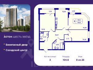 3-комн. квартира с предчистовой отделкой в ЖК "Астон. Шесть Звезд" на 8 этаже. Общая площадь: 104.6 кв.м., жилая: 52.24 кв.м., площадь просторной кухни-столовой: 16.66 кв.м. Угловая квартира, идеально подойдет любителям тишины и панорамных видов. В квартире две лоджии, два совмещенных санузла. Высота потолков 2.65 м.