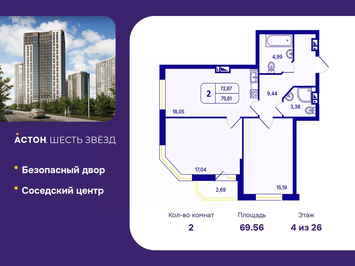 2-комн. квартира от застройщика с предчистовой отделкой в ЖК "Астон. Шесть Звезд" на 4 этаже. Общая площадь: 69.56 кв.м., жилая: 32.23 кв.м., площадь просторной кухни-столовой: 18.05 кв.м. Квартира угловая, идеально подойдет любителям тишины и панорамных видов. В квартире одна лоджия, два совмещенных санузла. Высота потолков 2.65 м.