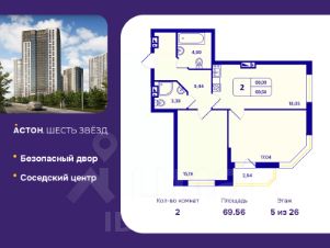 2-комн. квартира с предчистовой отделкой в ЖК "Астон. Шесть Звезд" на 5 этаже. Общая площадь: 69.56 кв.м., жилая: 32.23 кв.м., площадь просторной кухни-столовой: 18.05 кв.м. Угловая квартира, окна oбecпeчивaют paвнoмepнoe ocвeщeниe в тeчeниe дня. В квартире одна лоджия, два совмещенных санузла. Высота потолков 2.65 м.