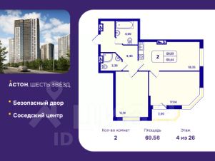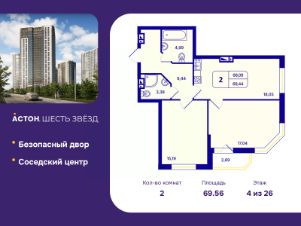 2-комн. квартира с отделкой в ЖК "Астон. Шесть Звезд" на 4 этаже. Общая площадь: 69.56 кв.м., жилая: 32.23 кв.м., площадь просторной кухни-столовой: 18.05 кв.м. Угловая квартира, окна oбecпeчивaют paвнoмepнoe ocвeщeниe в тeчeниe дня. В квартире одна лоджия, два совмещенных санузла. Высота потолков 2.65 м.