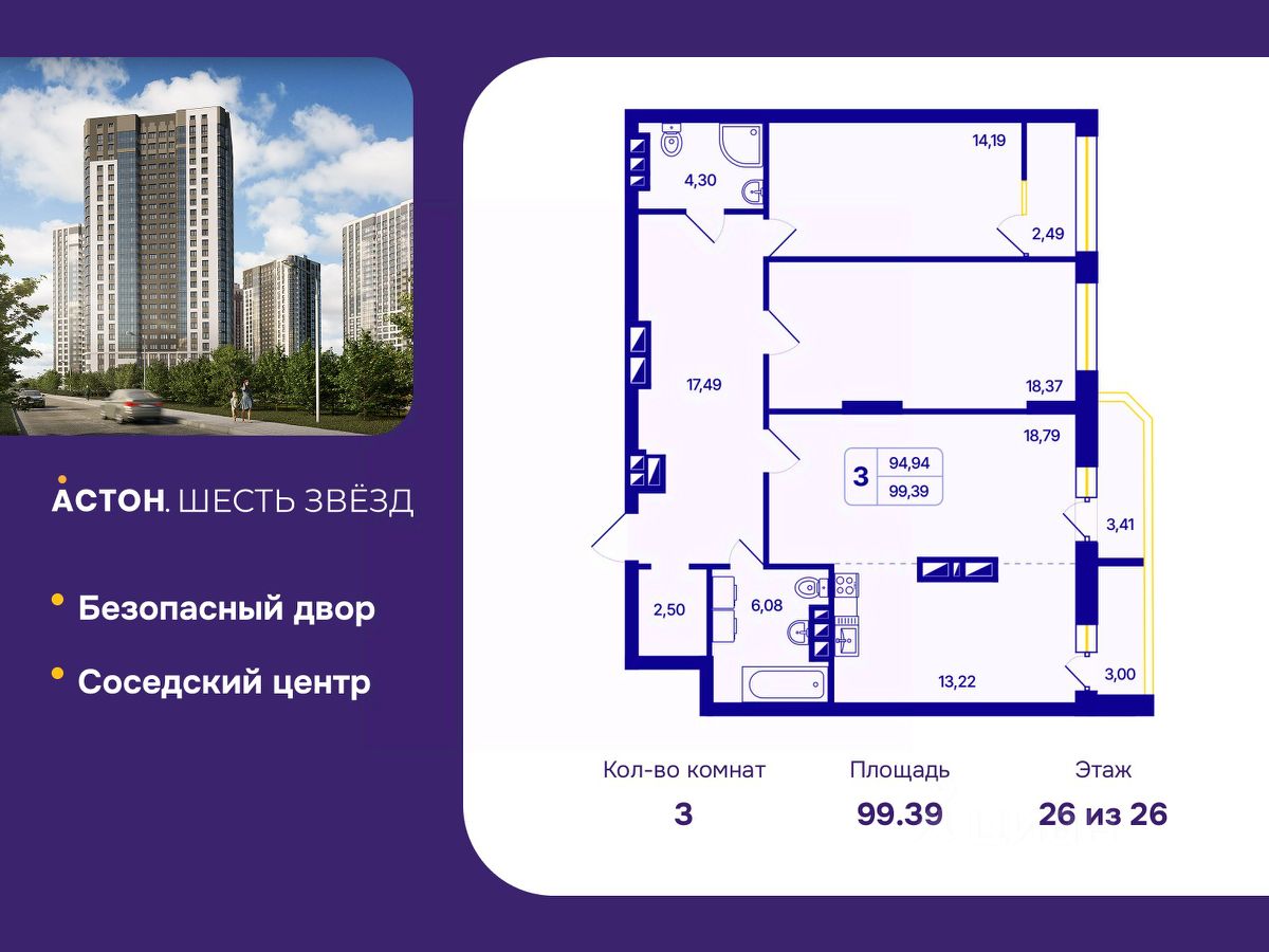 3-комн. квартира с европланировкой и предчистовой отделкой в ЖК "Астон. Шесть Звезд" на 26 этаже. Общая площадь: 99.39 кв.м., жилая: 51.35 кв.м., общая площадь гостиной-столовой с кухонной зоной: 32.01 кв.м. Европейская планировка, кухня и гостиная объединены в одно просторное помещение. Комнаты изолированные, все окна выходят на одну сторону. В квартире два балкона, два совмещенных санузла. Высота потолков 2.65 м.