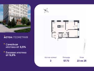Просторная трехкомнатная квартира с европланировкой и предчистовой отделкой в ЖК "Астон.Геометрия" на 23 этаже. Общая площадь: 57.73 кв.м., жилая: 39.49 кв.м., общая площадь гостиной-столовой с кухонной зоной: 21.93 кв.м. Европланировка, кухня и гостиная объединены в одно просторное помещение. Квартира угловая, очень светлая, естественная вентиляция при открытии окон. В квартире одна лоджия, один совмещенный и один раздельный санузел. Высота потолков 2.7 м.