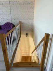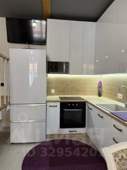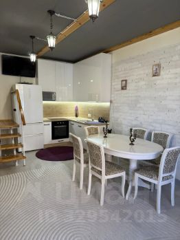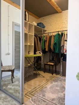 Квартира двухуровневая, на первом этаже расположен гараж, прихожая, санузел и кухня-столовая, на втором этаже просторная гостиная и спальня. В спальне вместительная гардеробная комната.