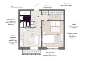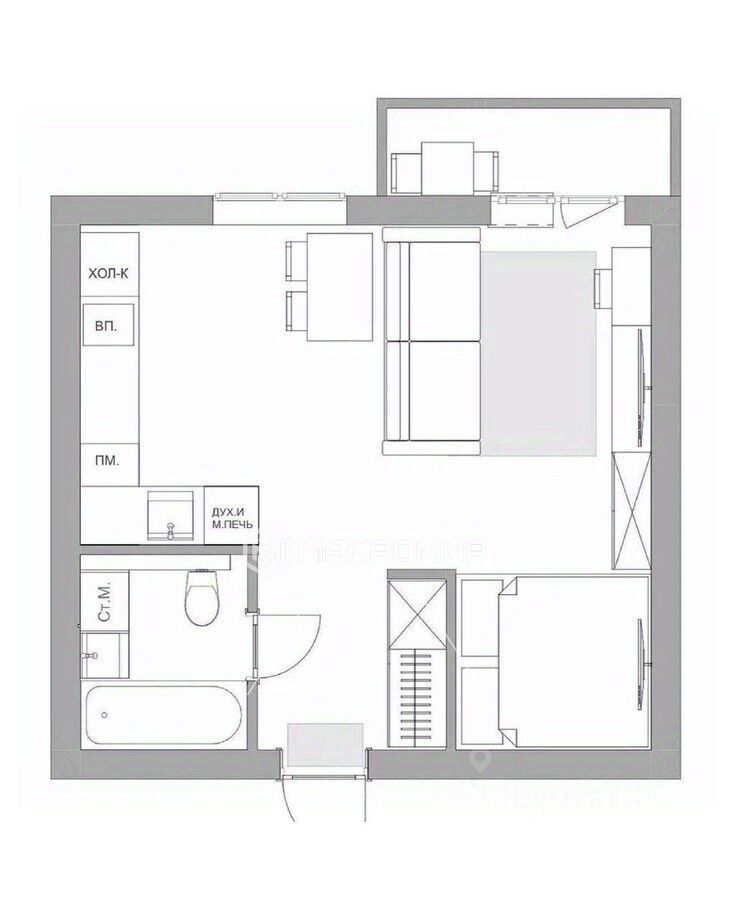- Просторная студия: общая площадь 38кв. м с высокими потолками (3 м), что создаёт ощущение простора и свободы.