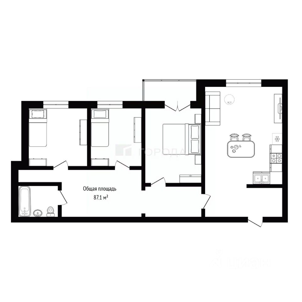 Общая площадь квартиры составляет 87,1 кв. м, жилая — 64 кв. м, а кухня — 20 кв. м. Простор и удобство планировки делают эту квартиру идеальным местом для жизни.