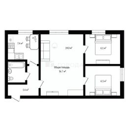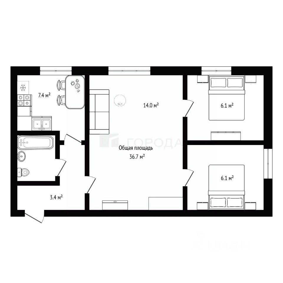 Квартира расположена на втором этаже двухэтажного панельного дома 1955 года постройки. Общая площадь составляет 36,7 кв. м, из которых 26,2 кв. м — жилая площадь. Три изолированные комнаты (6,1 + 6,1 + 14 кв. м) обеспечивают достаточное пространство для всей семьи. Высота потолков 2,5 м создаёт ощущение простора.