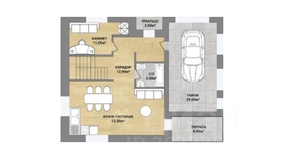 Планировка дома представляет собой просторную кухню-гостиную с четырьмя обособленными комнатами. В доме два полноценных входа, один из них с улицы, второй с террасы заднего двора. Большое кол-во панорамных окон в пол наполняют дом солнечным светом.