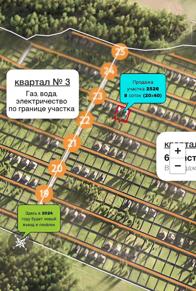 Участок 2526 правильной прямоугольной формы, без уклона. Расположен на самой верхней точке поселка, поэтому вода стоять не будет.