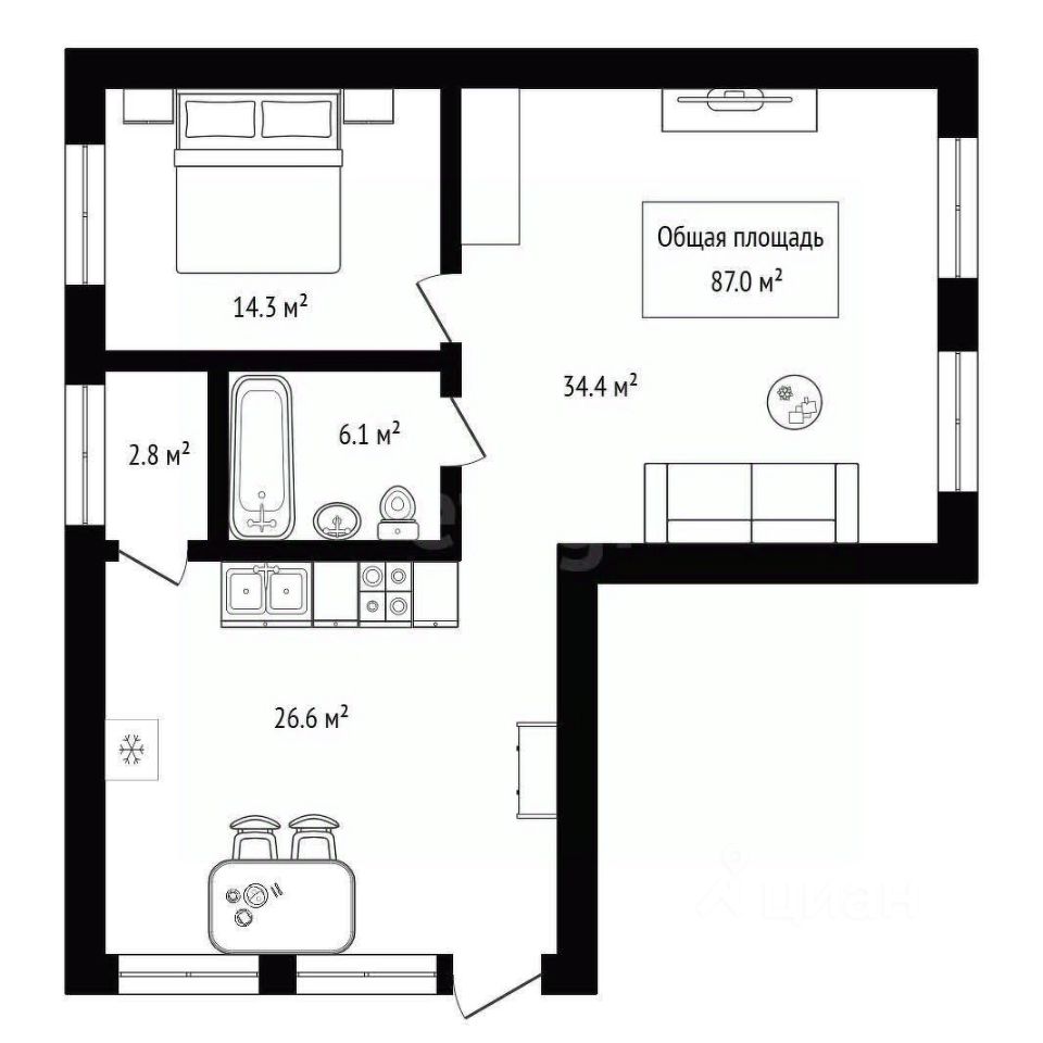- большая гостиная со свободной планировокой, есть возможность выделить 2 отдельные комнаты