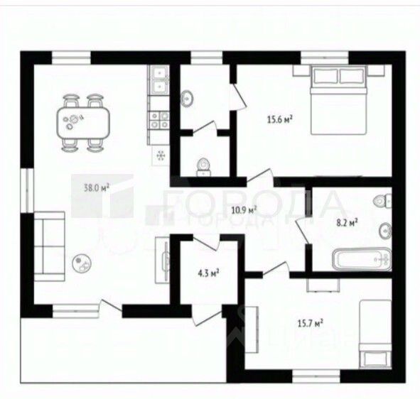 Удобная планировка включает кухню-гостинную, площадью 38 кв. м.