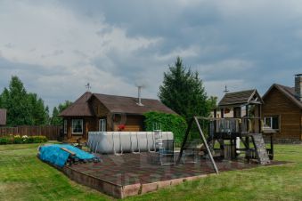 Так же за баней расположен бассейн, который устанавливается в летнее время, детская площадка и большая качеля.