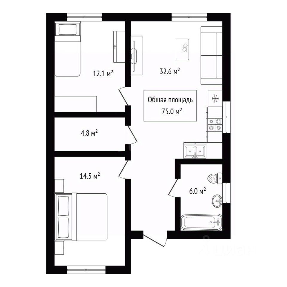 Дом включает в себя две удобные спальни, кухню и просторную гостиную, что позволяет комфортно разместиться всей семье и создать атмосферу домашнего тепла и уюта. Просторная планировка открывает возможности для реализации ваших дизайнерских идей и превращения дома в идеальное пространство для отдыха и общения с близкими.