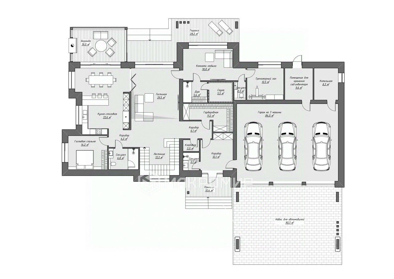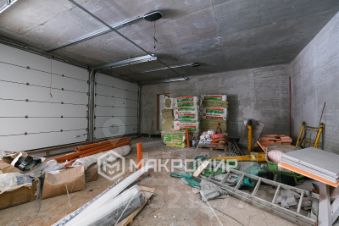 На первом этаже предусмотрена просторная кухня-столовая 33,6 м2 с выходом на закрытую веранду с панорамным остеклением, большая гостиная в 40 м2, спальня для гостей 14,2 м2, тренажерный зал, комната отдыха с видом на бор и отдельным выходом на террасу, сауна, вместительный гараж на 3 машины 85 м2 , а так же предусмотрен дополнительный навес еще для трех автомобилей.