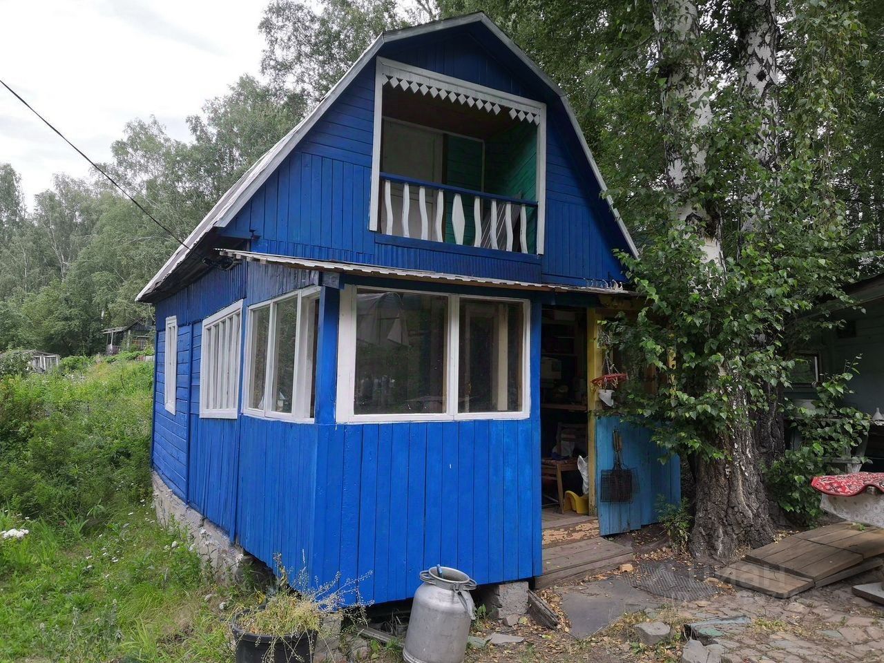 Участок площадью 10 соток прекрасно благоустроен, подведены электричество и водоснабжение. Дом построен из дерева, кровля покрыта профнастилом.