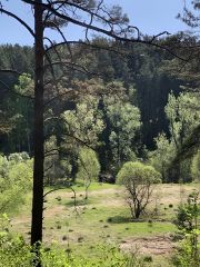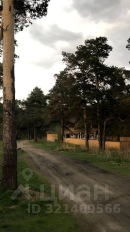 На участке вдоль границы с соседним участком стоят взрослые деревья, сосны и березы.