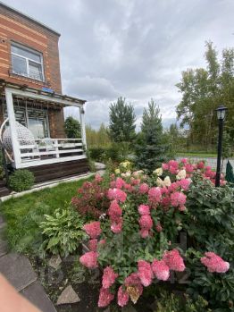 - Окружение: Дом окружён ухоженным участком с зеленой травкой, цветами, декоративными растениями, такими как ели, туи, гортензии, рябинки, яблони и лиственные деревья, создавая атмосферу гармонии и покоя.