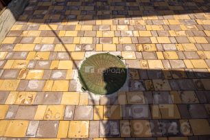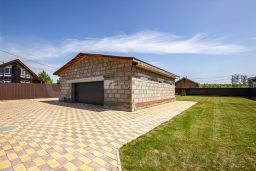 Участок выровнен и отсыпан, благоустроенная территория: ухоженный газон и брусчатка.