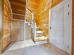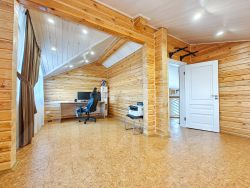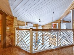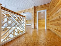 -Поднимаемся по деревянной лестнице на второй этаж дом: где расположены три уютные спальни, холл в виде балкона где открывается вид на гостиную с панорамными окнами