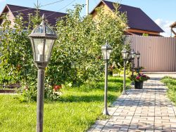 Участок огорожен капитальным забором из металлопрофиля, с установленными светильниками по периметру. Два вьезда и две входные калитки на участок.