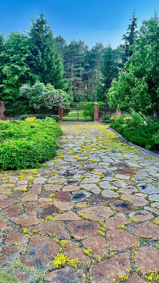 Дорожки вымощены крупным гранитным камнем и речной галькой с Горного Алтая.
