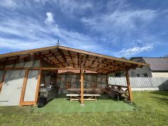 Отдельностоящая летняя веранда с техническим блоком расширяет жилое пространство — здесь оборудована летняя кухня для проведения семьей времени на свежем воздухе.