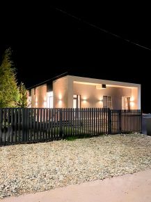 В цокольном этаже гараж на 4 машины, бойлерная, прачечная, кладовая. На первом жилом этаже просторный холл с зоной хранения, два санузла, гардероб, кухня-гостиная с выходом на террасу, 3 спальных комнаты.