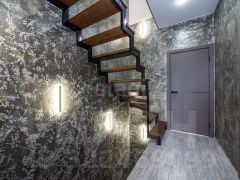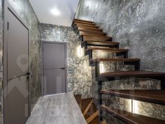 Межэтажная лестница из металлокаркаса с прочными ступенями из лиственницы добавляет дому шарм и надежность.