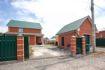Просторный, отдельно стоящий гараж из газобетона облицован кирпичом.