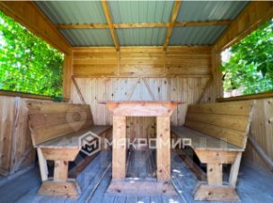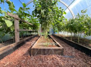Участок ровный и правильной формы 6 соток, где размещены дом-баня, беседка, две теплицы, хозблок и туалет. Вода из собственной скважины (нет ржавчины).
