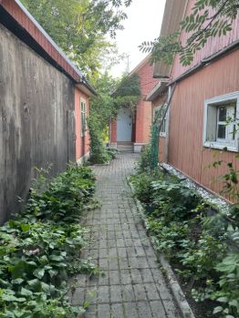На участок два входа, с двух улиц.Есть дом (комбинированные материалы - кирпич, брус) 52 кв м (две комнаты на первом этаже, печь, камин, одна комната на втором), гараж с погребом, летняя кухня с кухонным гарнитуром, холодильником, диваном и просторная баня 27 кв м с двумя комнатами отдыха, помывочной и парилкой. Остается вся мебель, холодильник.