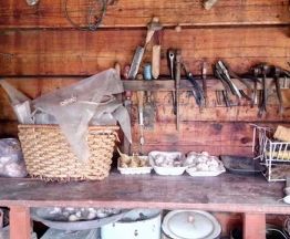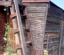 Баня также, из бруса, отдельно моечная, парная и комната отдыха. Слева к бане примыкает сарай, справа- душ и лестница на чердак.