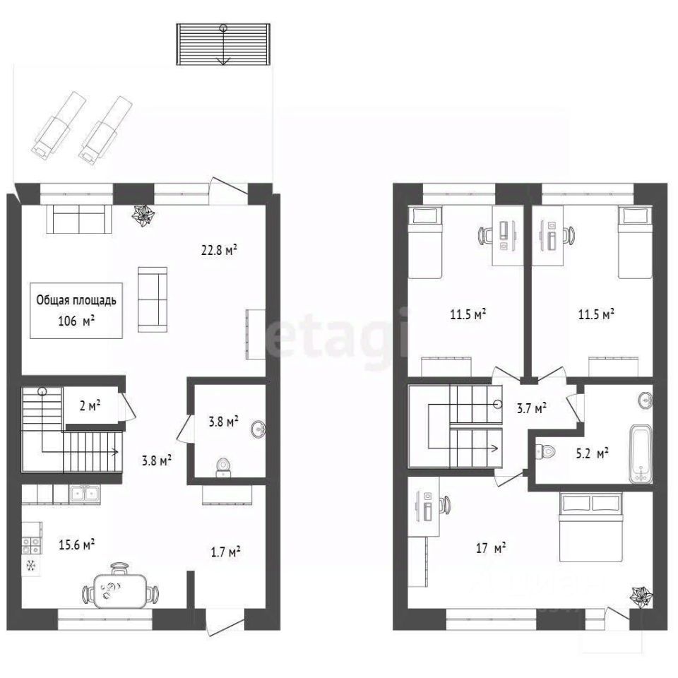 Два этажа, общая площадь 106 м² (плюс подвал и чердак), продуманная планировка. На первом — кухня 16 м², гостиная 23 м², санузел 4.6 м² и коридор 6.2 м². Из гостиной — выход на просторную террасу 17 м² и участок 1.5 сотки, где можно устроить барбекю или уютный сад. Есть парковка на несколько автомобилей.