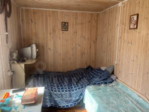 Большая комната, можно там жить. Стоит диван и все необходимое для проживания. Газовая печка и баллон, холодильник. 2 окна, одно сплошное, второе открываться.
