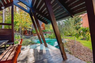 Участок коттеджа обладает редким преимуществом: он является крайним к лесу. Ландшафтный дизайн сливается с естественным лесным массивом, создавая эффект максимально расширенного пространства.