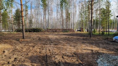 Участок находится в тихой части посёлка с собственным выходом в лес, уже подготовлен под строительство: подключено электричество, организован въезд с укладкой дренажной трубы, и самое главное расчищен от деревьев и кустарников.