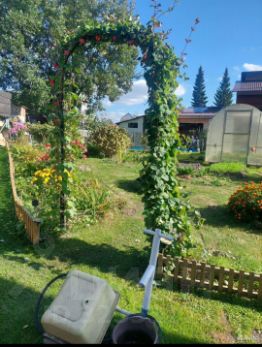 На участке много посадок и цветов.