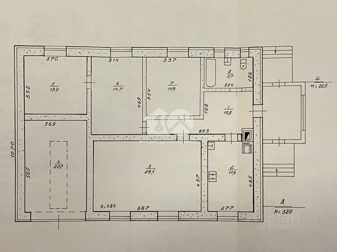 Общая площадь дома — 96,8 кв. м, из них жилая — 68,7 кв. м. В доме три комнаты, высота потолков — 2,65 м. Есть косметический ремонт, индивидуальный котёл отопления, центральные водоснабжение и канализация. На участке площадью 4,68 соток есть баня и гараж.