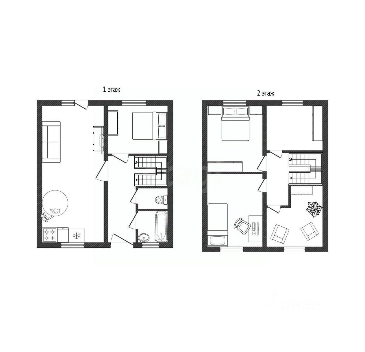 Планировка дома состоит из четырех изолированных комнат и просторной кухни-гостиной, что формирует комфортное пространство для жизни всей семьи.