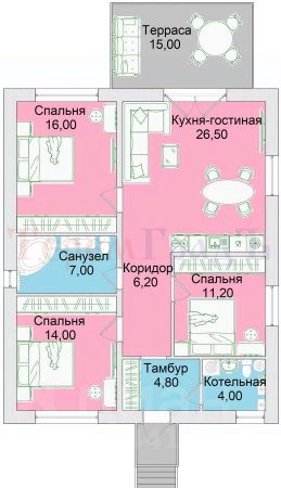 Коттедж состоит из кухни-гостиной - 26 кв.м, 3 (трёх) спален - 16, 14 и 11,5 кв.м., и вспомогательных помещений: холла, коридора, санузла и второго малого санузла, включающего в себя котельную. Высота от пола до потолка 3 метра. Все материалы и комплектующие в доме высокого заводского качества!