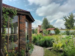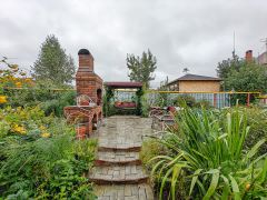 Обустроена зона барбекю. Много посадок разных растений и цветов.
