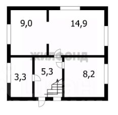 На первом этаже кухня-гостиная, спальня, сан узел/котельная.