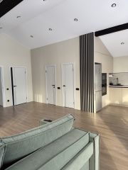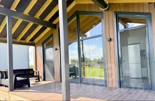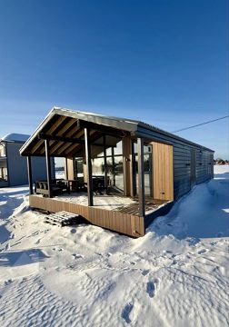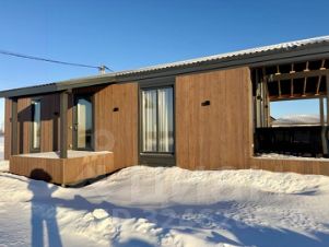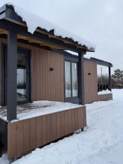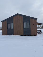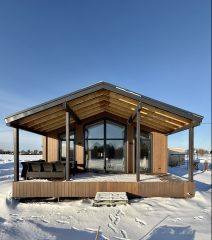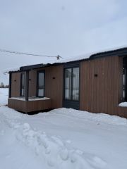 Дом одноэтажный, из сэнгвич-панелей, пол и потолок толщина панелей 224 мм, стен 180 мм. По всему периметру панели закрыты ветровлагозащитной пленкой . Наружный фасад комбинированный: металлический сайдинг и планкен.