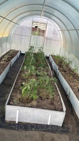 На территории теплица, две стационарные грядки с посадками, много различных деревьев: груши, вишни, малина, разные цветы.