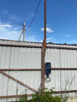 Участок огорожен забором из металлопрофиля на фундаменте, лицевая сторона с кирпичными столбами, распашными воротами для вьезда и калиткой.