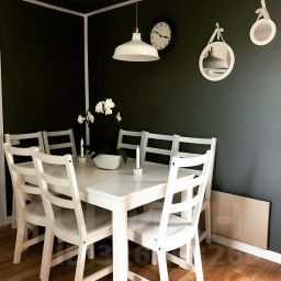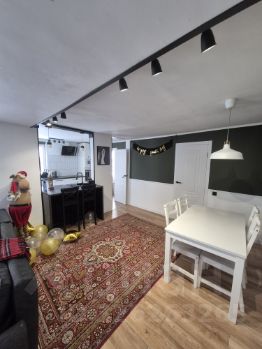 В доме просторная гостиная, разделенная на 2 зоны, зона столовой со столом на 8 человек и зона релакса с диваном и телевизором.