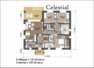 В доме три спальни, шикарная кухня-гостиная площадью 22,7 кв.м., два санузла, постирочная, котельная, две гардеробные комнаты, одна из которых в хозяйской спальне, а также общая кладовая.