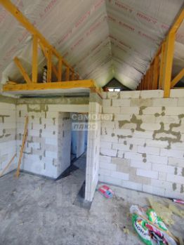Дом построен из легкого и прочного газабетона, фундамент 25 см ж/б плита, коробка из сибита 400 мм, внешняя отделка дома еще не завершена, внутренние перегородки из сибита 100 мм, окна пвх с ламинацией, дверь с терморазрывом, утепленная крыша с огне и биозащитой, водосточная система, подшив свесов и карнизов, закладные под коммуникации.