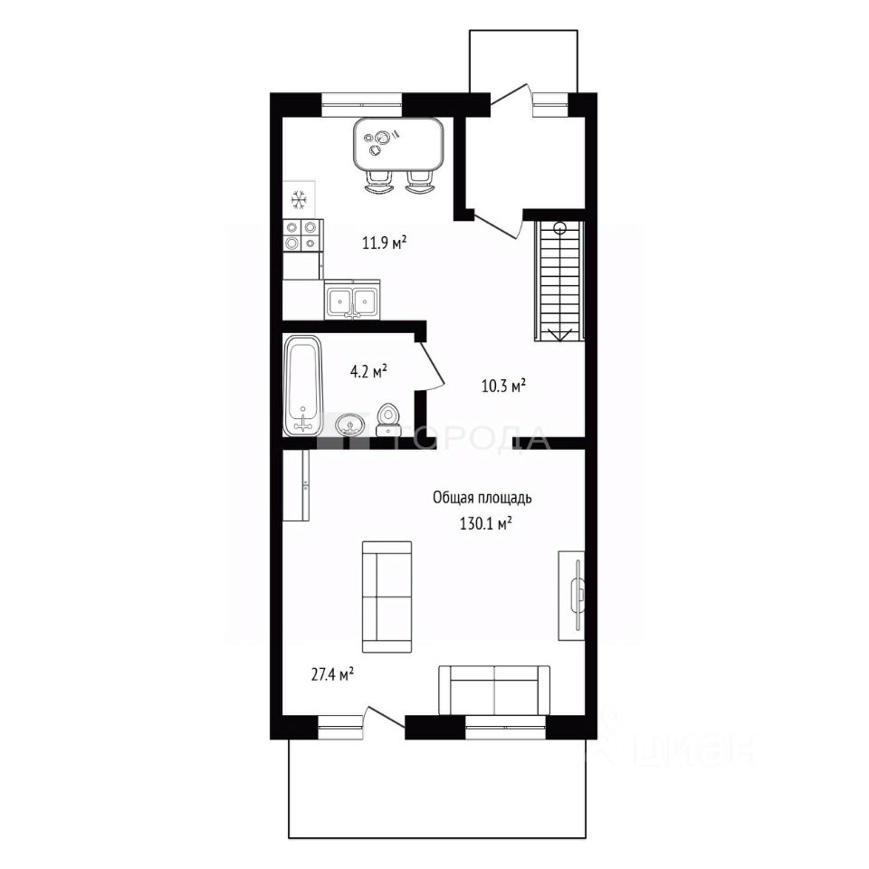 Общая площадь — 130,1 кв. м, жилая — 85,7 кв. м. В доме три комнаты (27,4 + 30,4 + 27,9 кв. м) и кухня площадью 11,9 кв. м.