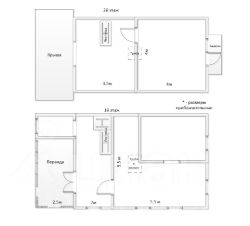 В доме 2 этажа. 1 этаж: веранда, прихожая, 2 большие комнаты (большая кухня-гостиная с камином) и спальня. 2-ой этаж: просторная комната 16 м2 с балконом.
